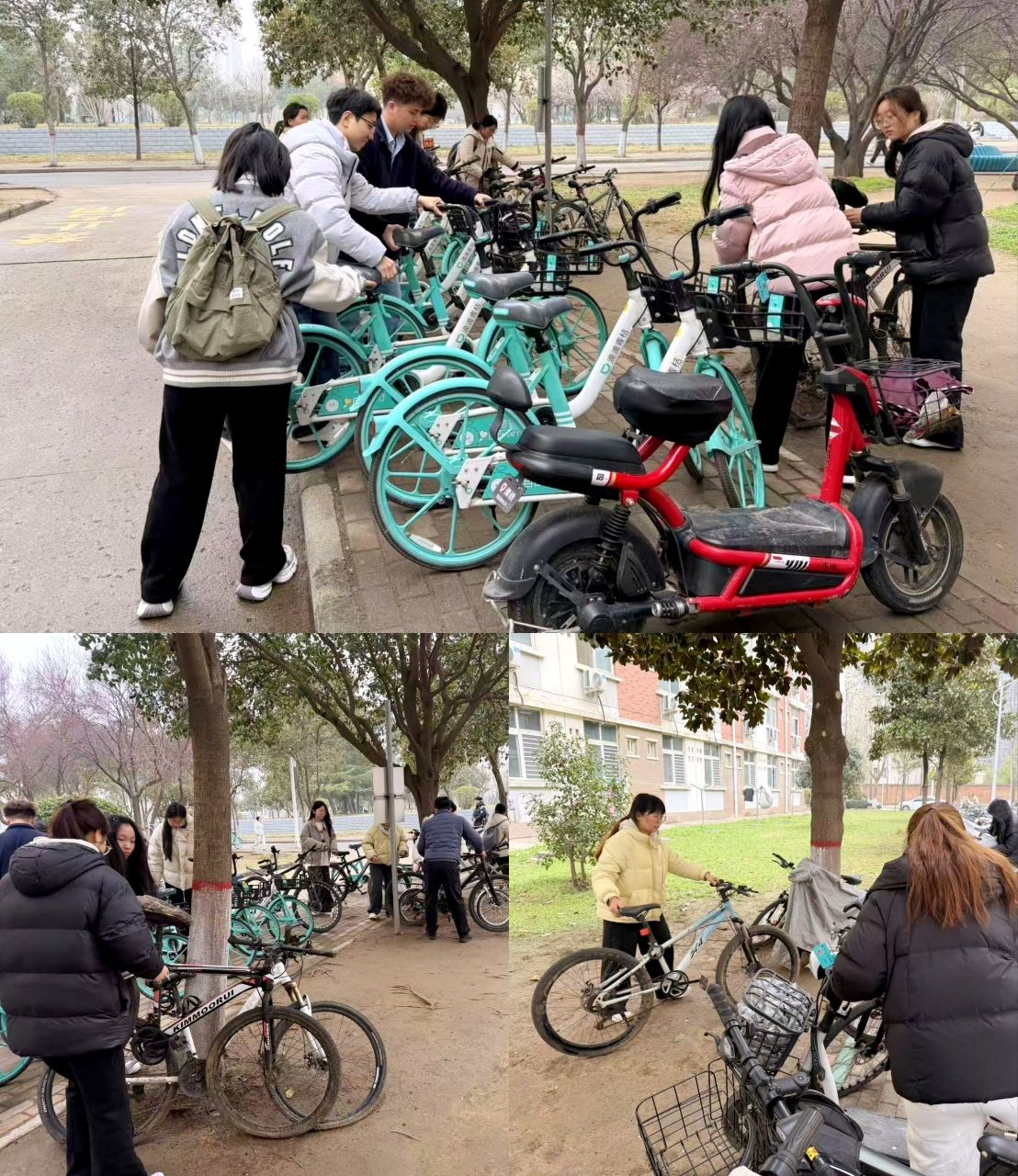 南苑员工公寓二号楼、三号楼周边是同学们个人自行车及校园共享单车集中停放区,由于空间有限且长期无人使用自行车较多,停放区内自行车摆放随意,比较杂乱,严重影响使用效率。志愿者们以此为切入点,细致调整停车角度,使其"车头朝外、间距均匀",将长期无人使用的自行车集中摆放以节省空间,将违停的自行车放回指定区域。经过大家努力,原本杂乱的停车区域变得井然有序,为春日校园增添了一道文明风景线。