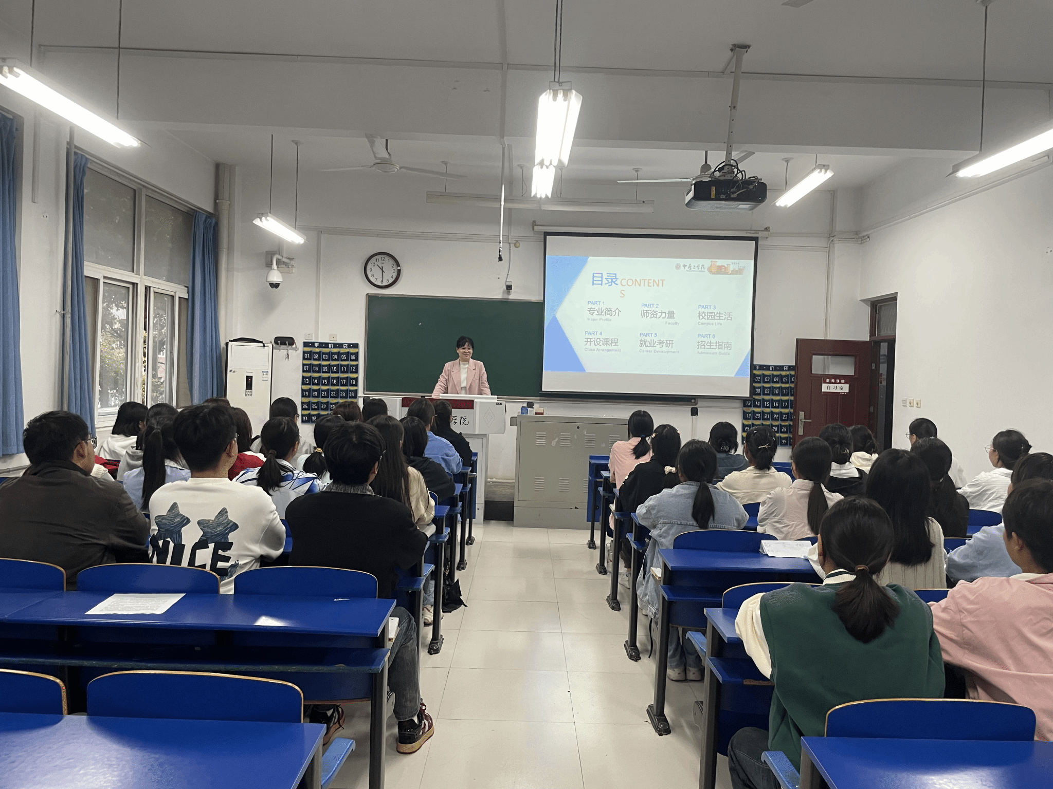 首先,郭亭亭老师向同学们详细介绍了英语专业的发展历程、师资力量、开设课程、就业方向及未来发展。郭老师详细介绍了英语专业培养方案,鼓励同学们对自己的大员工活做好规划。
